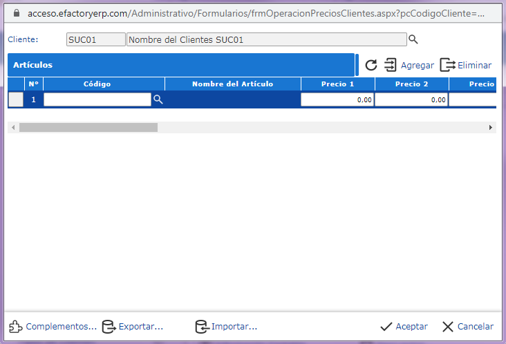 Para establecer los precios por cliente en eFactory, es necesario primero buscar al cliente y luego asignar todos los precios de los artículos a ese cliente, pero el sistema no cuenta con un