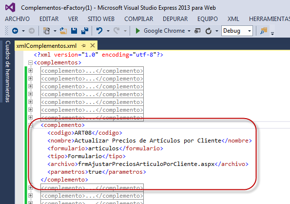 en la carpeta "eFactory\Administrativo\Xml". Este será el fragmento XML que define nuestro complemento: