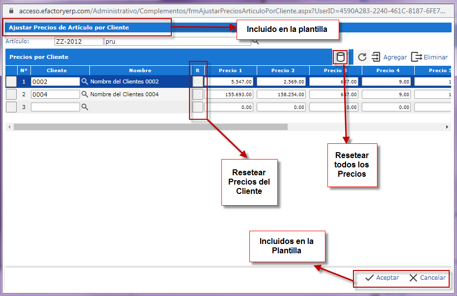 Para ver el detalle del método mCargarPreciosArticulo(), que busca los precios por cliente y los carga en el grid puedes revisar el archivo del complemento en la carpeta correspondiente de eFactory. Los botones del encabezado del grid y de la columna tipo botón se usarán para reestablecer los precios asignados a todos los clientes o al cliente de esa fila, respectivamente, a los valores actuales del precio del artículo seleccionado: