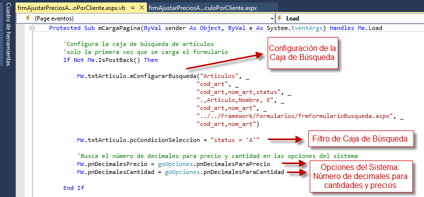 En el evento LOAD del formulario se realiza la configuración inicial de los controles, y se reciben los parámetros enviados por el formulario de origen (en este caso el formulario de Artículos). Veamos la configuración de la caja de búsqueda: