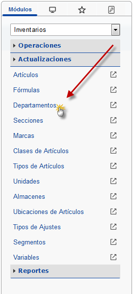 b. En el módulo Inventarios, desplegamos el componente Actualizaciones y activamos el sub componente Departamentos.