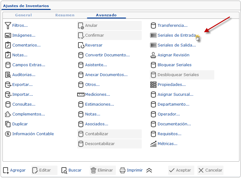 a. En la ficha Avanzados, Seleccionaremos la opción"Seriales de Entrada"