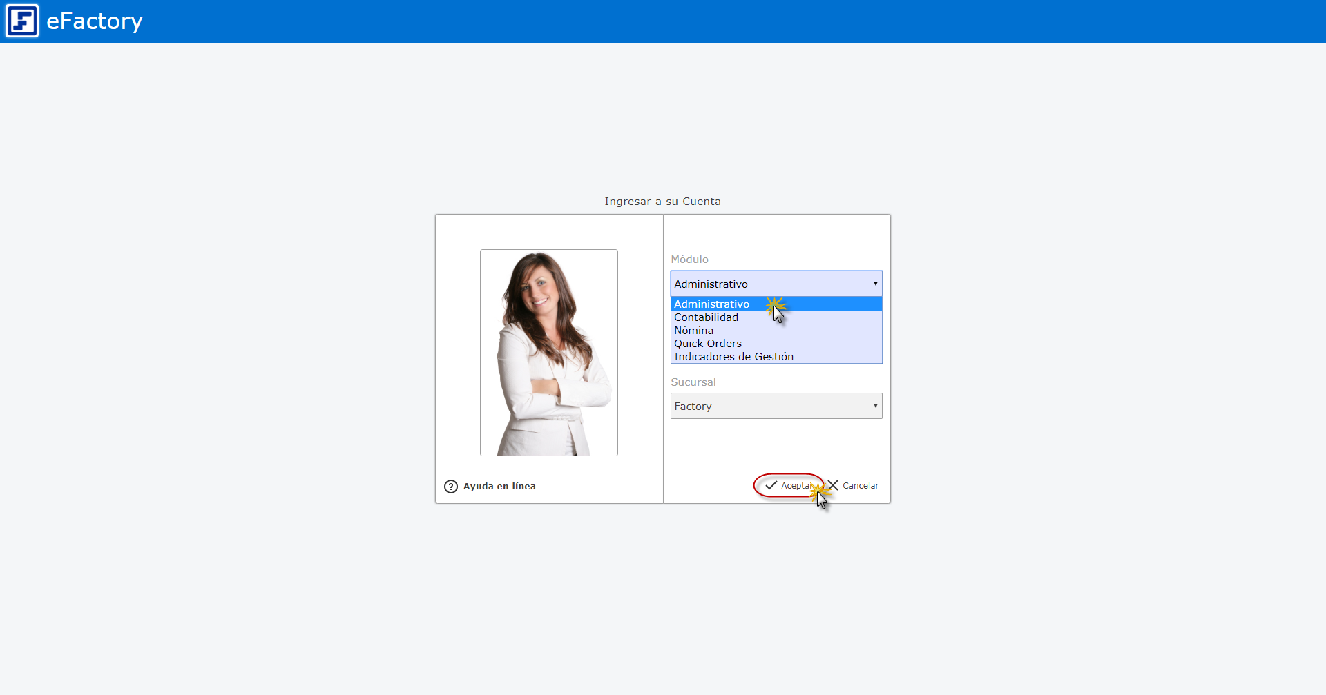a. Al iniciar eFactory, Seleccionamos la Aplicación