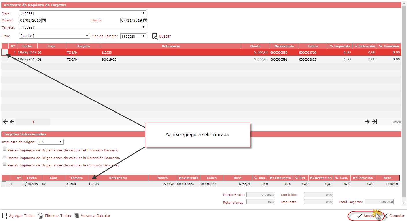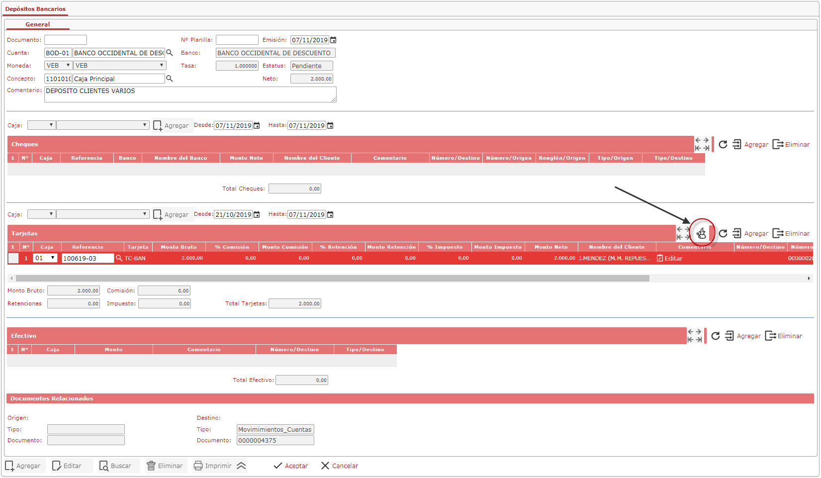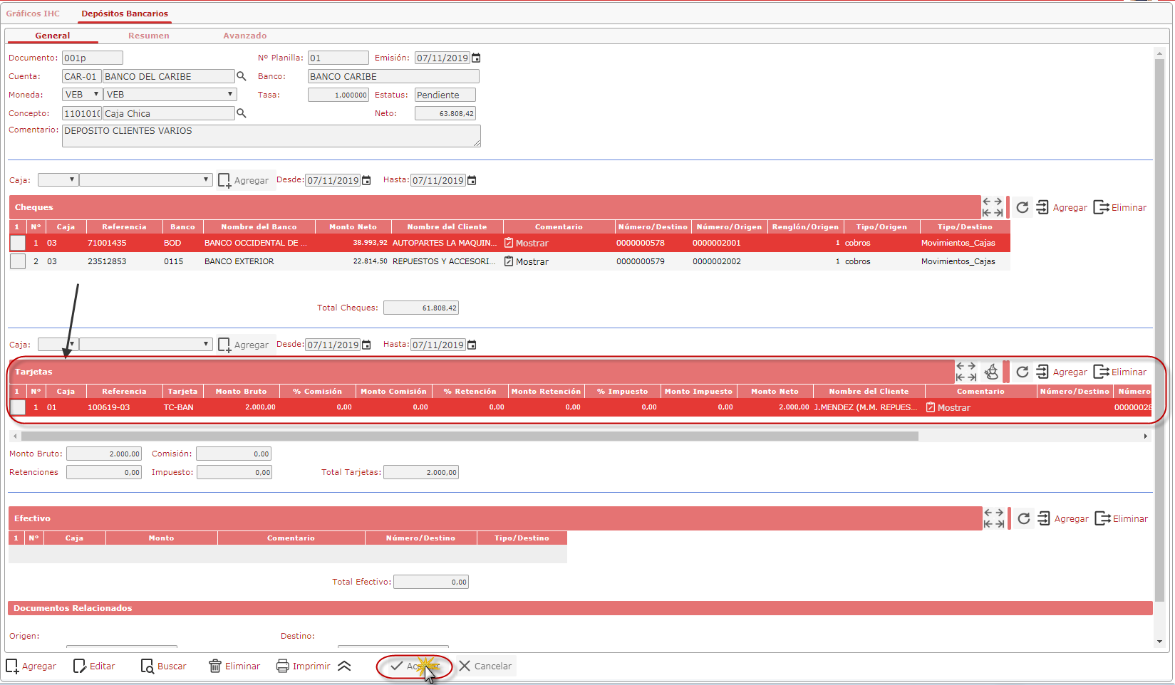 a. En la pantalla de Depósito Bancarios,para generar un asistente para depósito de tarjeta