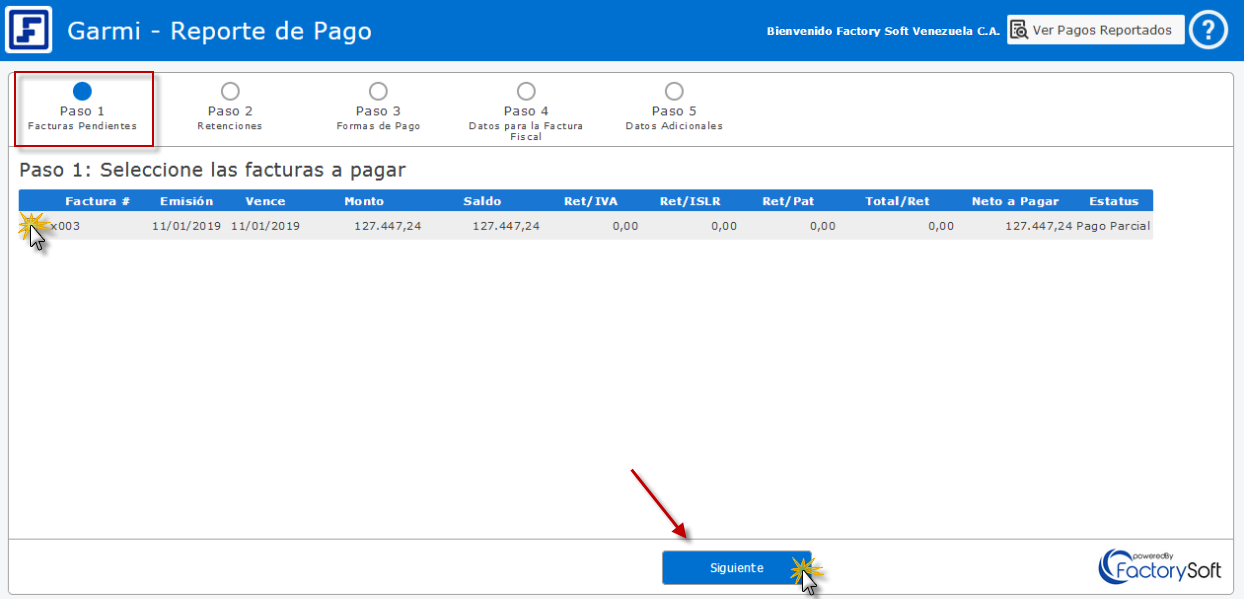a. Al iniciar sección se nos muestra la pantalla de Paso 1 - Facturas Pendientes, donde debemos selecionar la factura que deseamos pagar. Para cada factura que se muestra en pantalla, se veran la siguente información: