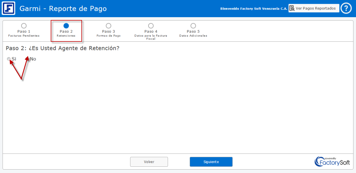 se nos muestra una interrogante en la pantalla de Paso 2, la interrogante es la siguiente: ¿Es Usted Agente de Retención?