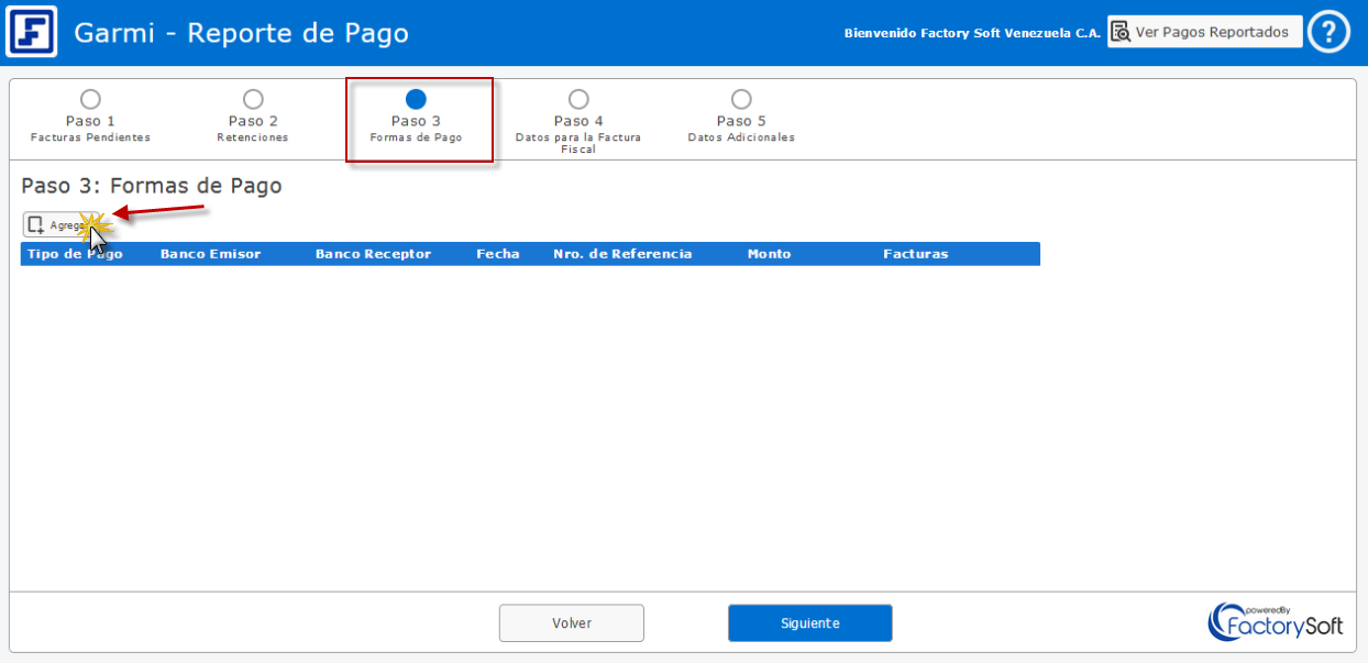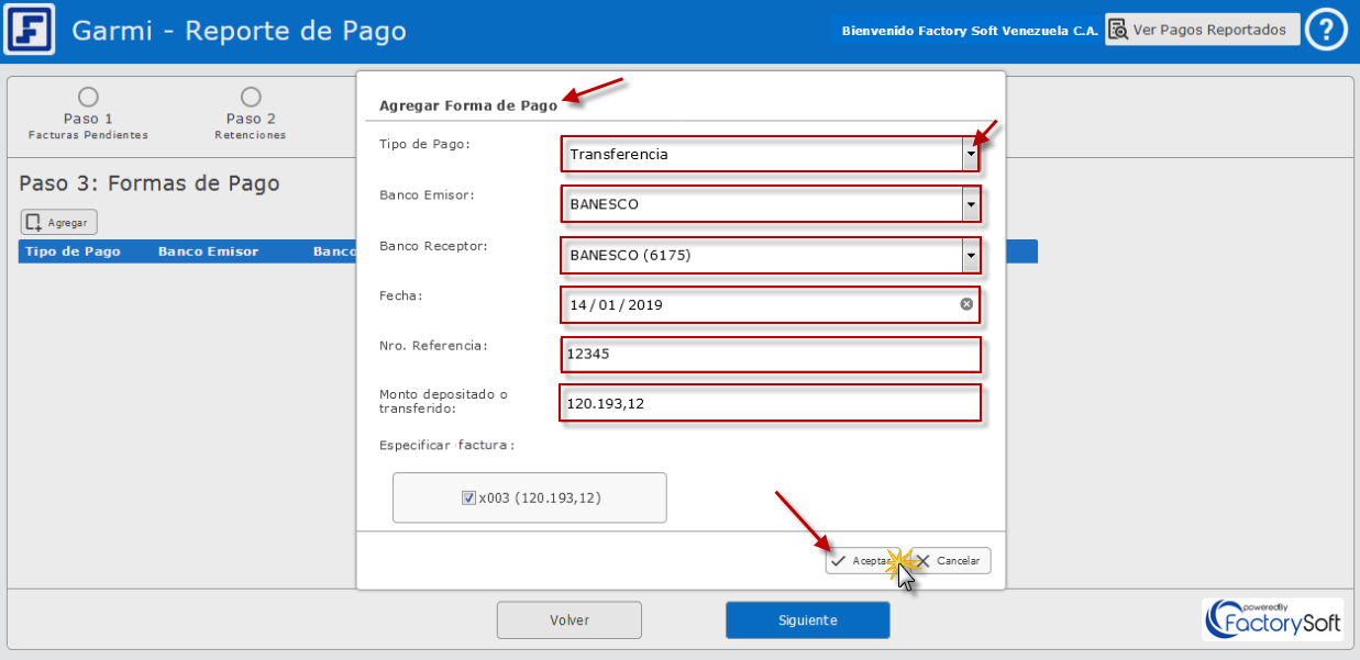 Nota: Todos los datos para agregar son obligatorio y debemos seleccionar al menos una factura para poder realizar la operación de agregar la forma de pago.