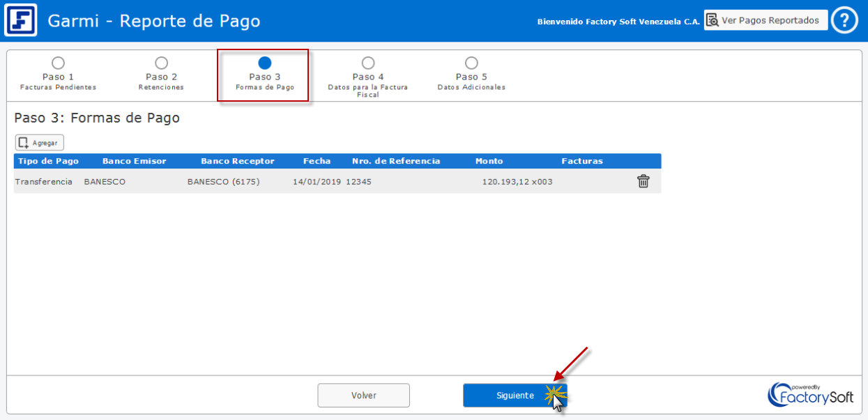 c. Después de añadir la forma de pago de la factura podemos visualizar los datos añadidos, el cual se puede eliminar y volver añadir.
