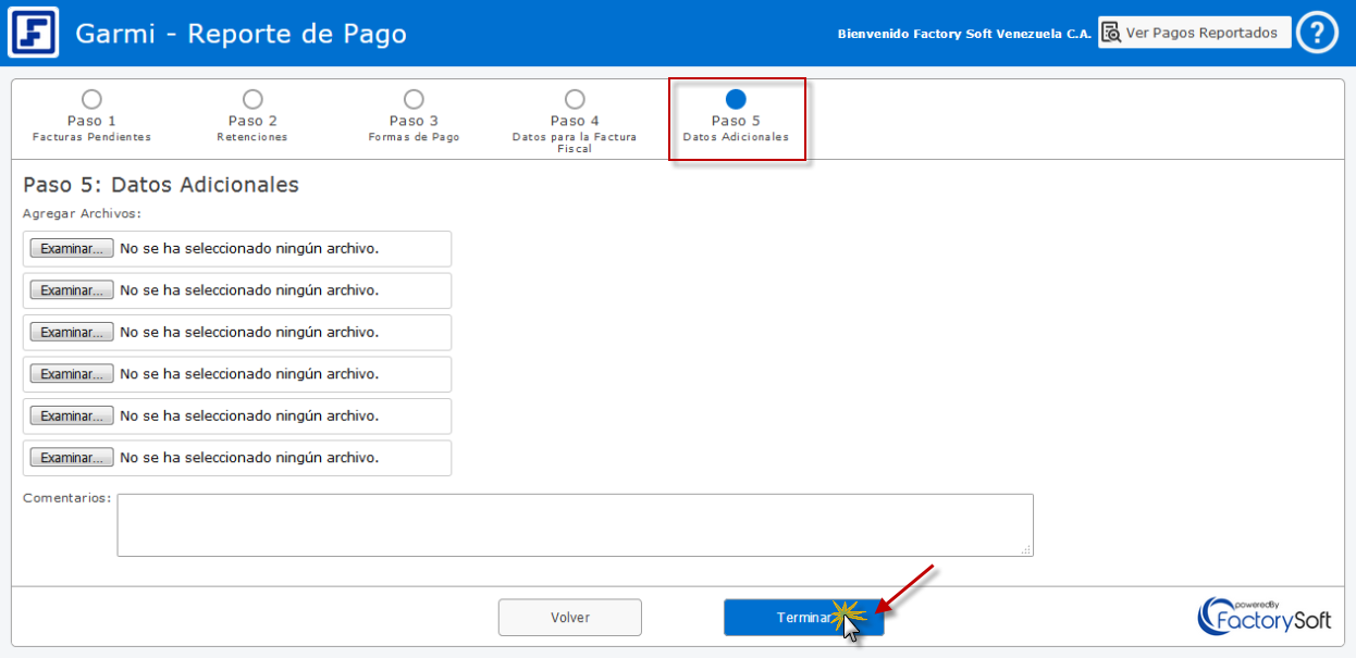 , para poder cargar esos archivos, también podemos registrar un comentario explicando los pagos realizados o indicando algun detalle sobre estos. Luego se procede a presionar el botón
