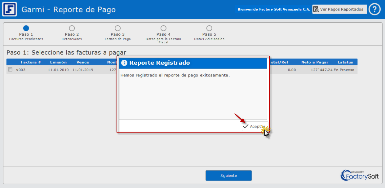 , se nos muestra una ventana notificando que se ha registrado el reporte de pago exitosamente.