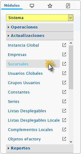 a. Al ingresar en el sistema debemos seleccionar el módulo Sistema y al desplegar la sección de Actualizaciones seleccionaremos la opción de Sucursales.