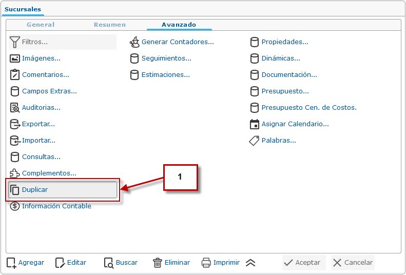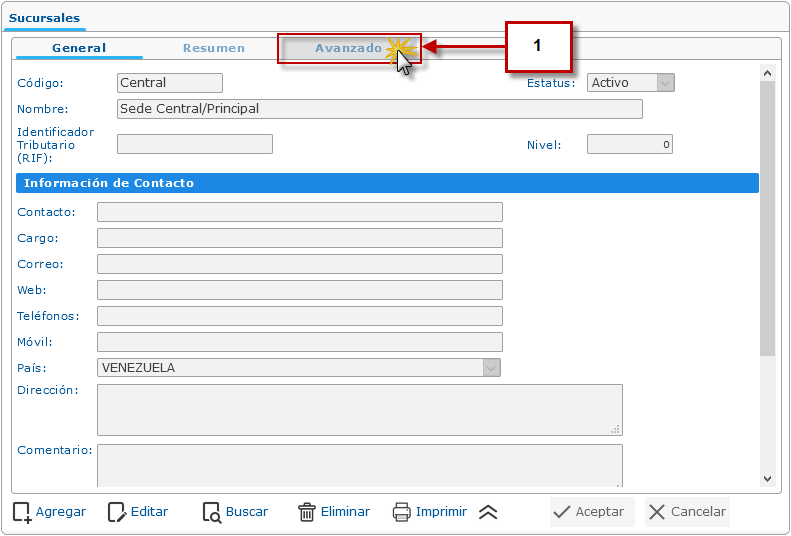 a. Al seleccionar la Sucursal procedemos a hacer clic en la pestaña Avanzado.