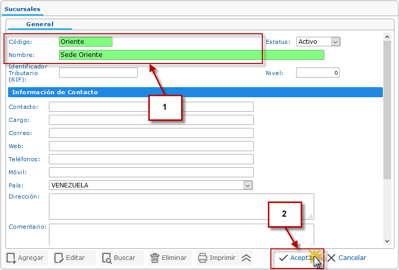 la Sucursal a la cual asignaremos la información contable.