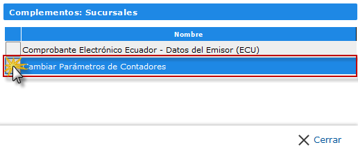 se abrirá la pantalla Complementos: Sucursales, en la que debemos hacer clic en la opción Cambiar Parámetros de Contadores.