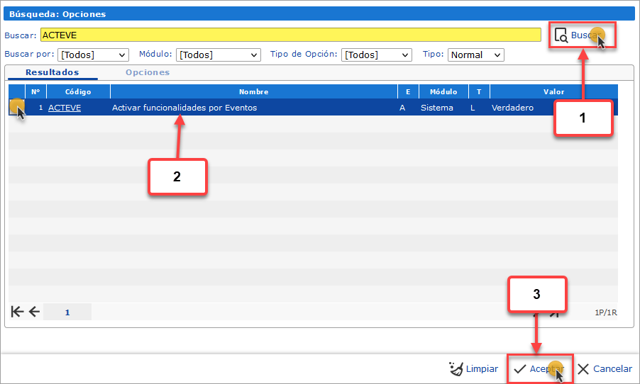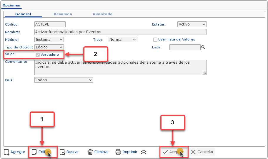 La programación y configuración de los eventos comienza activando las opciones ACTEVE - Activar funcionalidades por Eventos y ACTALE - Activar funcionalidadespor Alerta.