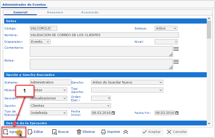 3. En la sección de Detalle de Ejecución: Se define el código que consultará los datos que serán utilizados por el evento y a su vez se define la condición de ejecución del mismo.