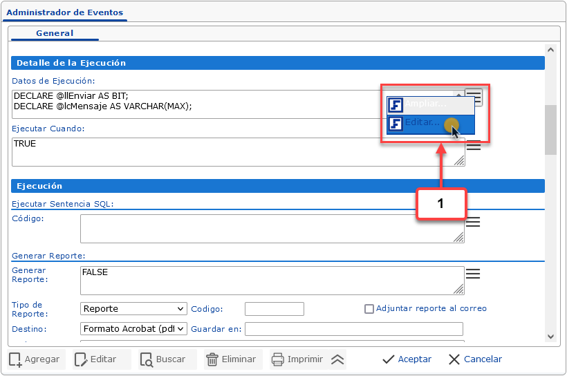 En este caso, para editar el contenido SQL o LIF de los campos de los eventos, es recomendable utilizar la ventana de edición. Para esto debemos hacer clic en la opción Edirar... del campo.