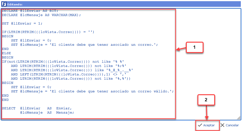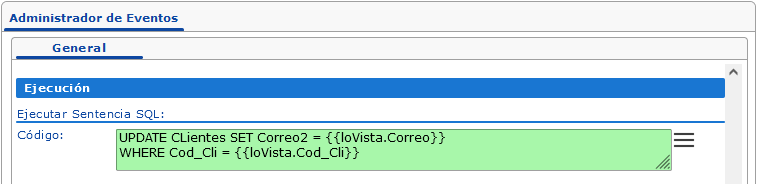 Por ejemplo, si se escribe la siguiente expresión actualizará el campo Correo2 del cliente actual: