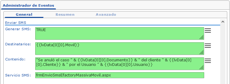 De la misma forma podemos crear el contenido del SMS en la consulta del evento y enviarlo en forma de parámetro a este campo, por ejemplo: