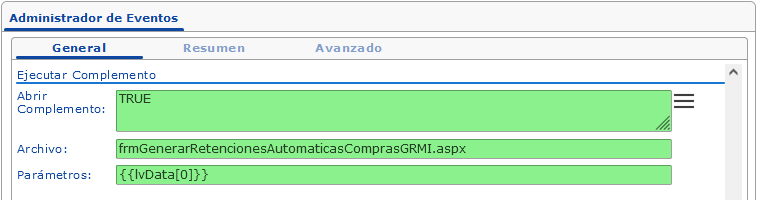 datos de ejecución. Al final de esta ayuda se encuentra el enlace Ejemplos de Eventos y Alertas que cuenta con ejemplos de aplicación más completos.