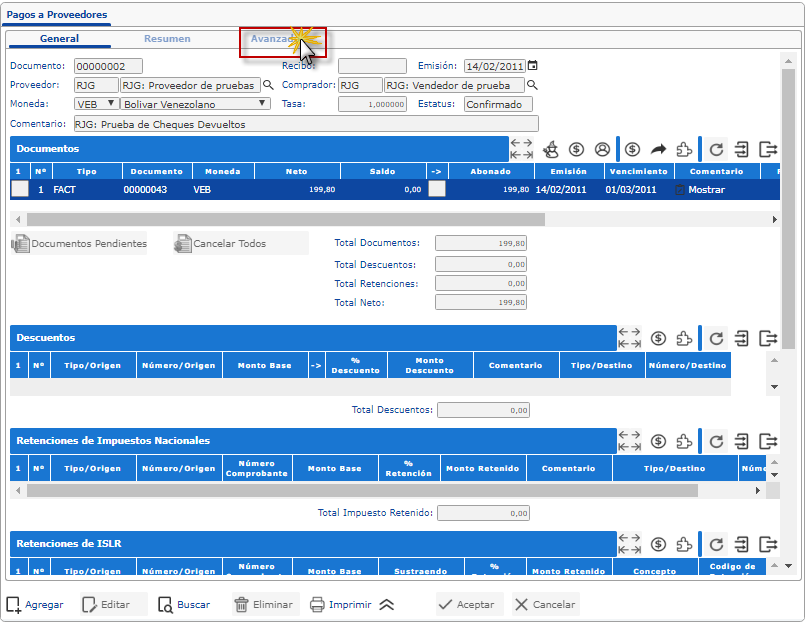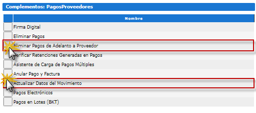 Una vez Reversado el Adelanto de Pago, Tenemos la posibilidad de Anular el Documento o también acceder a Complementos para Eliminar o Actualizar Datos del Movimiento, estas opciones se encuentran también en la pestaña Avanzado y se explican a continuación: