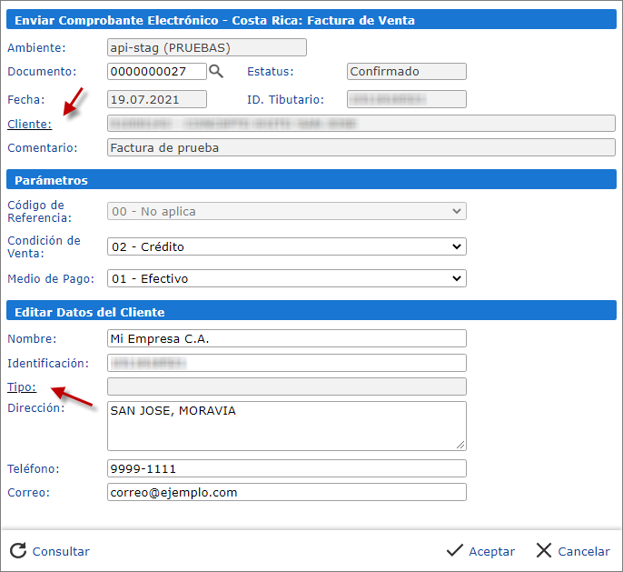 presionando la etiqueta "Cliente", también en "Tipo", se puede modificar los Datos del receptor.