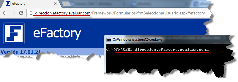En el caso particular de eFactory, determine la dirección a trazar, seleccionándola de la barra de direcciones del navegador. Tome de esta solo la dirección inicial, el resto de la dirección ignórela para este procedimiento. En las ilustraciones siguientes se otorgan los ejemplos de cómo debería quedar para cada caso.