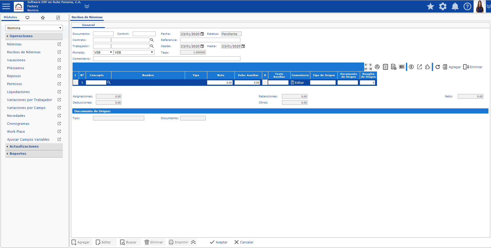 a. Al seleccionar el Maestro Recibos de Pago Allí te aparecerá una ventana en donde podrás agregar un nuevo recibo de nómina,