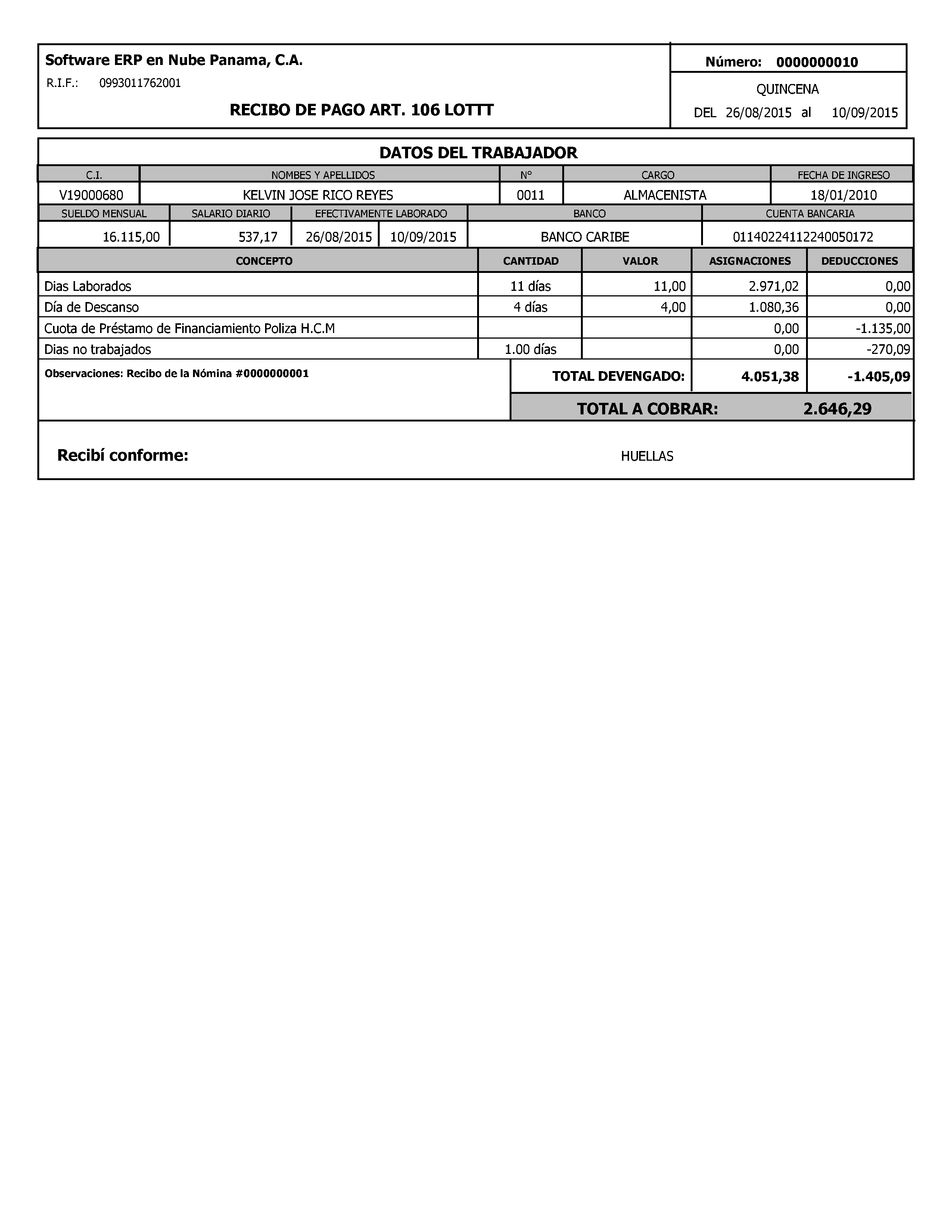 c. Luego se observa detalladamente el formato de Recibo de Paggo del Módulo de Nómina.