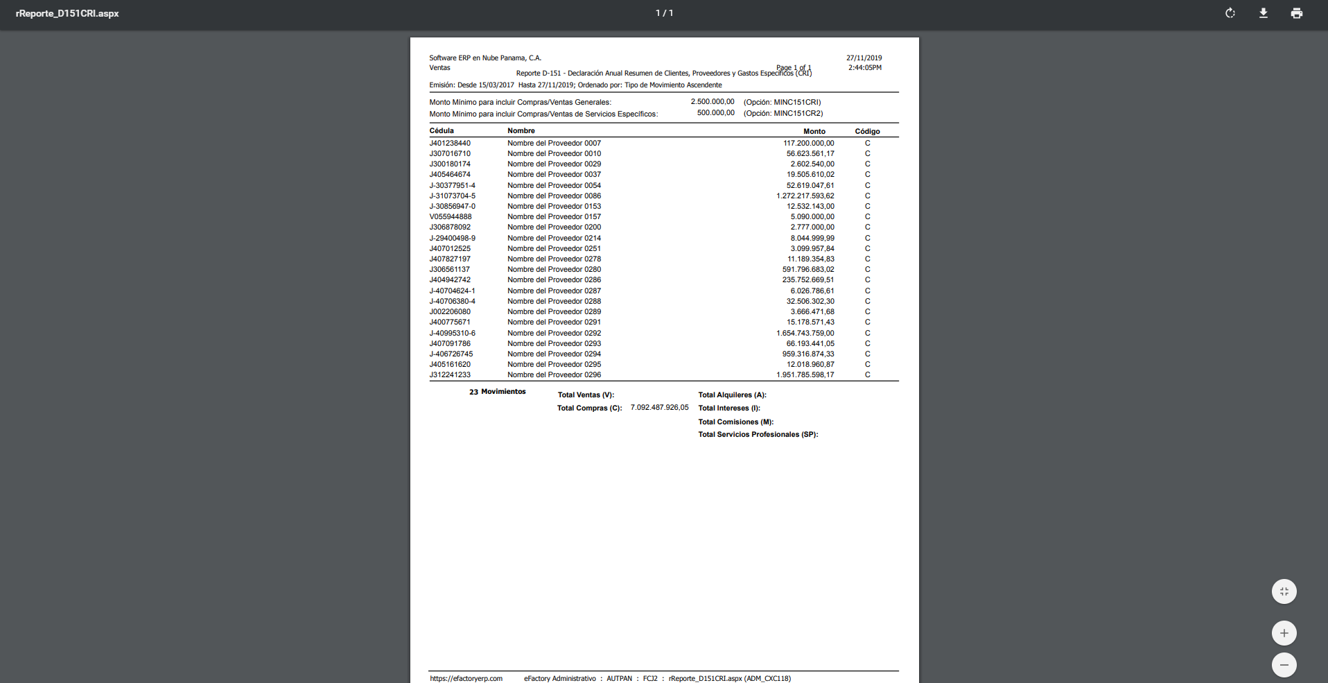 se muestra el Reporte D-151 Declaración Anual Resumen de Clientes, Proveedores y Gastos Específicos (CRI).